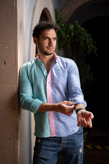 CAMISA FORTROP BICOLOR VERDE CLARO Y AZUL CLARO, ALETILLA COLOR ROSA TELA ALGODÓN TIPO OXFORD...