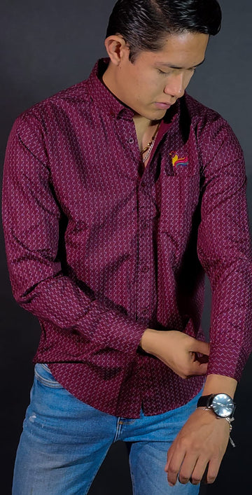 CAMISA CABALLERO SR. GALLO COLOR TINTO ESTAMPADO LÍNEAS ONDULADAS TELA 50% ALGODÓN Y 50% POLIÉSTER...
