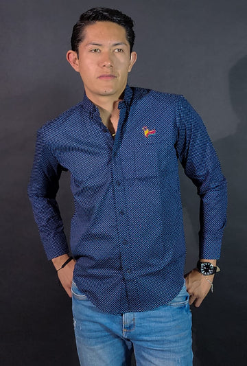 CAMISA CABALLERO SR. GALLO COLOR AZUL MARINO ESTAMPADO PUNTOS TELA 50% ALGODÓN Y 50% POLIÉSTER...