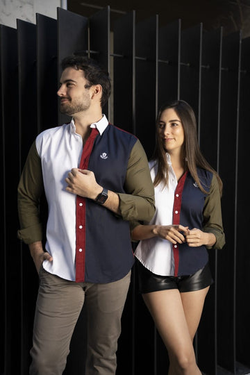 CAMISA CABALLERO Y DAMA FORTROP BICOLOR BLANCO Y AZUL MARINO, MANGAS COLOR VERDE MILITAR; ALETILLA...