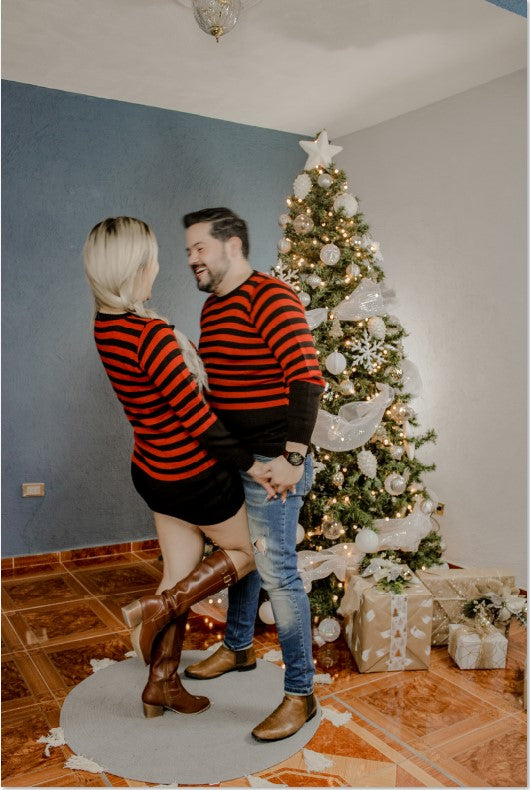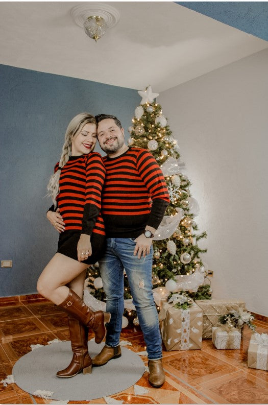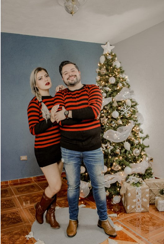 DUO SWETER Y VESTIDO MANGA LARGA COLOR CAFE RAYAS NARANJA TELA TIPO ACRILAN