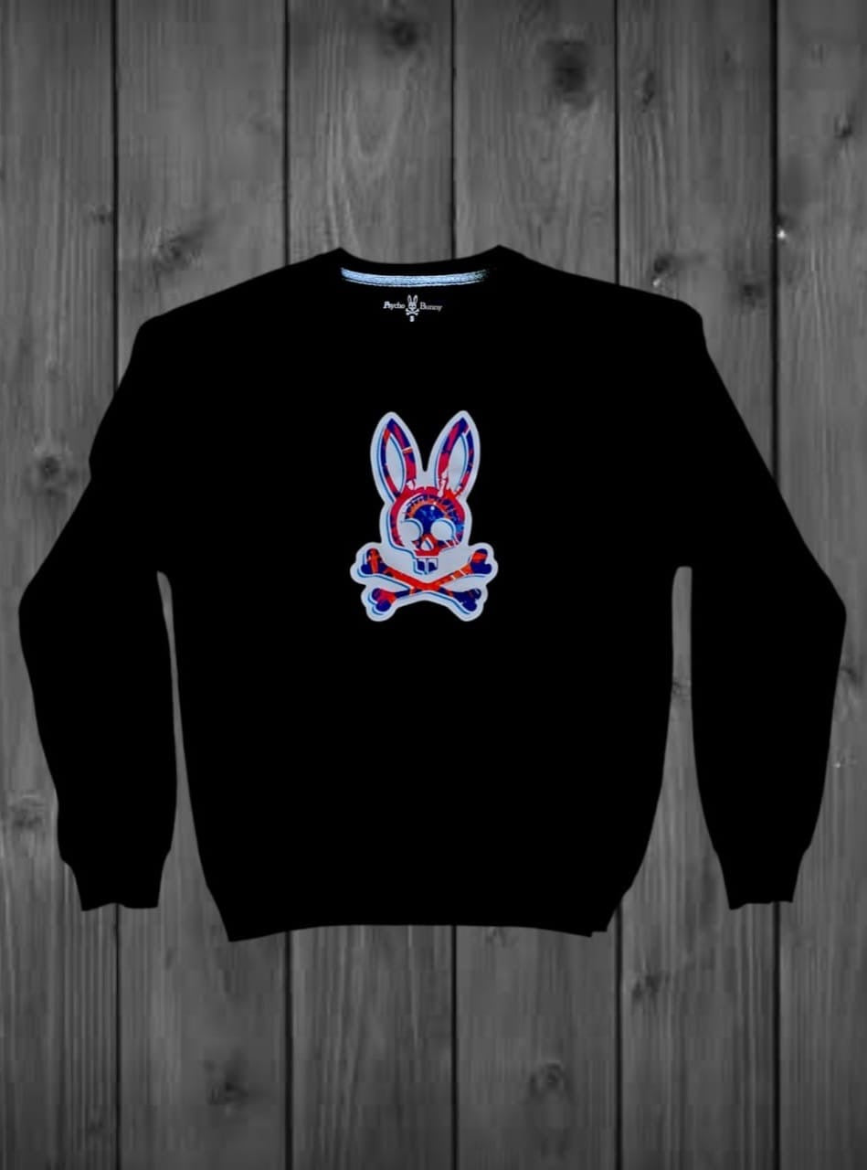 SUDADERA CABALLERO COLOR NEGRO, ESTAMPADO CONEJO COLOR ROSA, AZUL Y BLANCO
