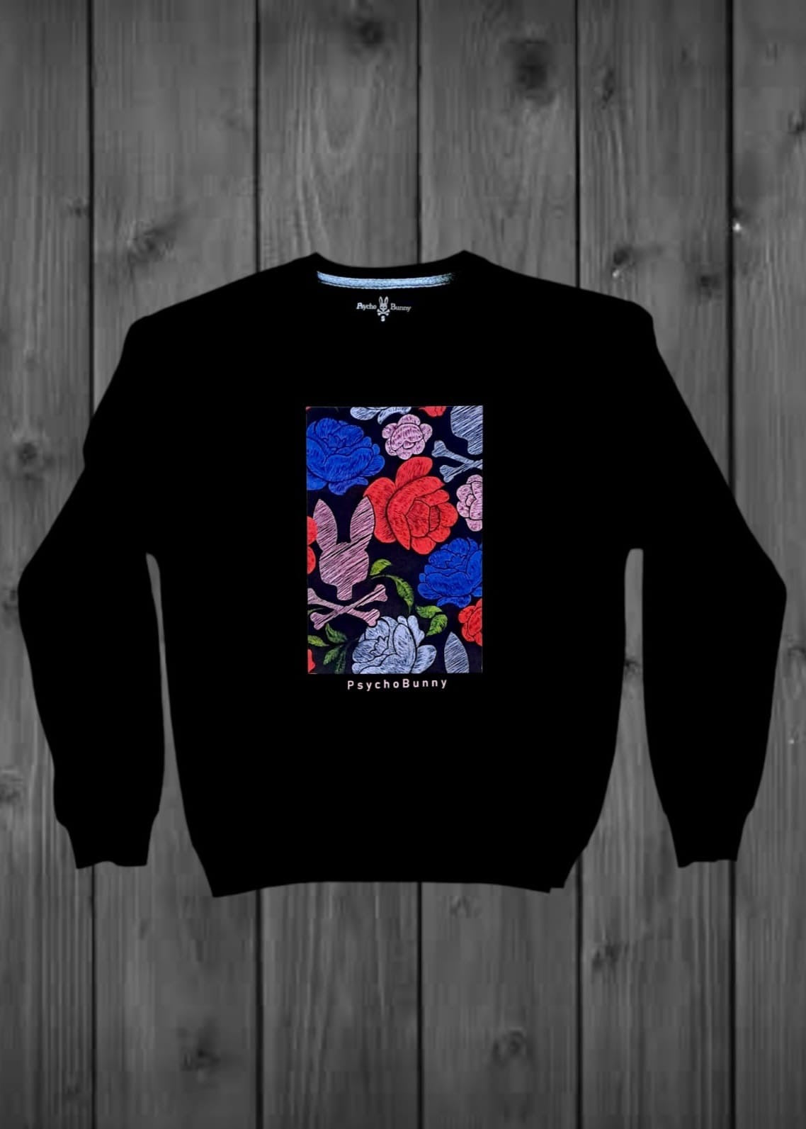 SUDADERA CABALLERO COLOR NEGRO, ESTAMPADO CO CONEJO Y FLORES MULTICOLOR