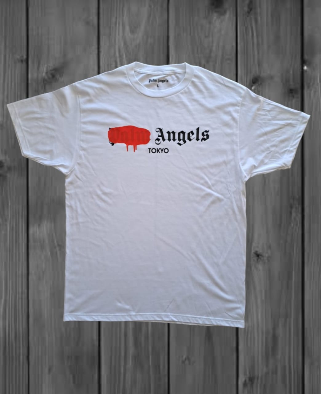 CAMISETA CABALLERO COLOR BLANCO, ESTAMPADO LETRSA COLOR NEGRO CON MANCHA COLOR ROJO