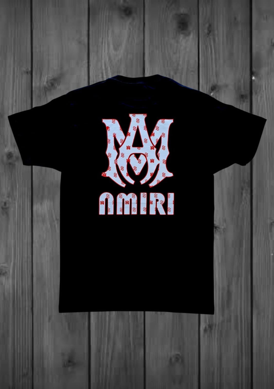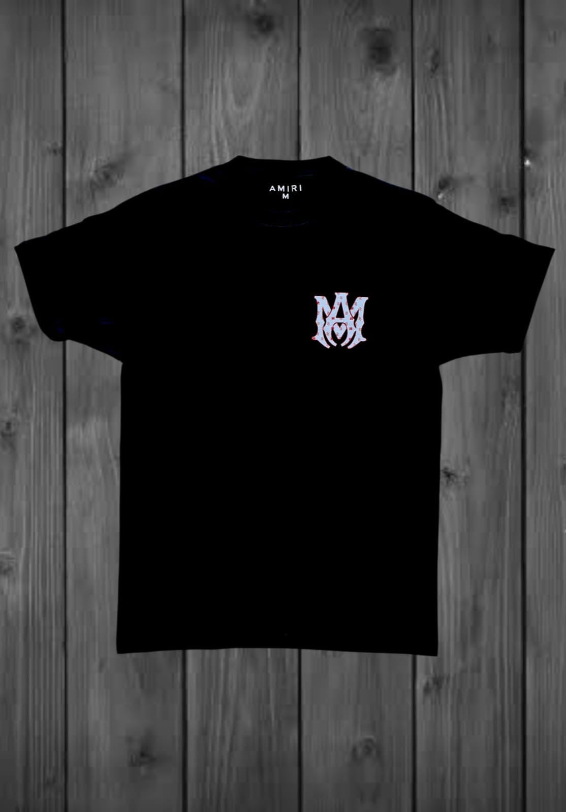 CAMISETA CABALLERO COLOR NEGRO, ESTAMPADO AL FRENTE Y EN ESPALDA DE LOGOTIPO AM Y LETRAS COLOR BLANCO CON CONTORNO COLOR ROJO