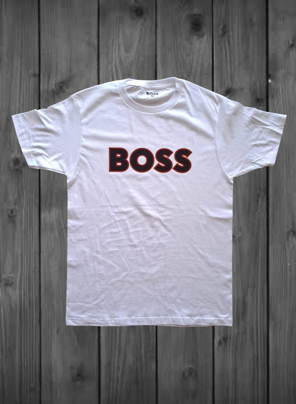 CAMISETA CABALLERO COLOR BLANCO, ESTAMPADO LETRAS COLOR NEGRO CON CONTORNO COLOR ROJO