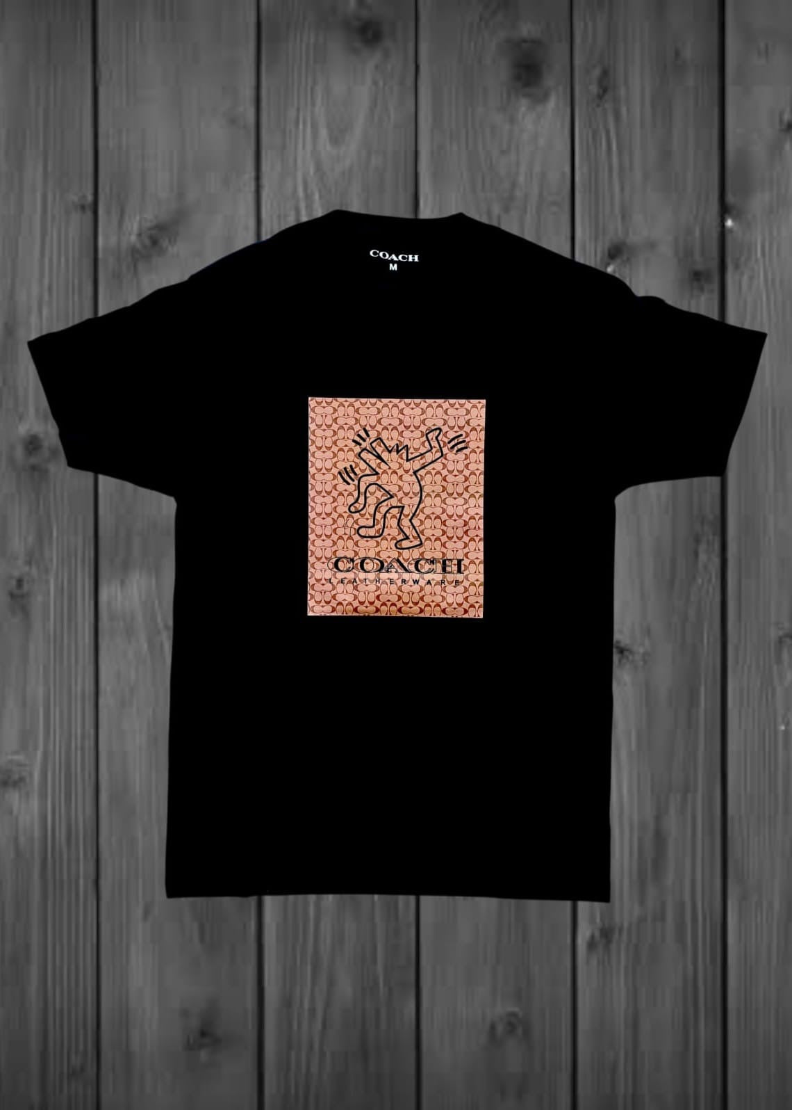 CAMISETA CABALLERO COLOR NEGRO ESTAMPADO COLOR CAFÉ CON LETRAS Y CONTORNOS COLOR NEGRO
