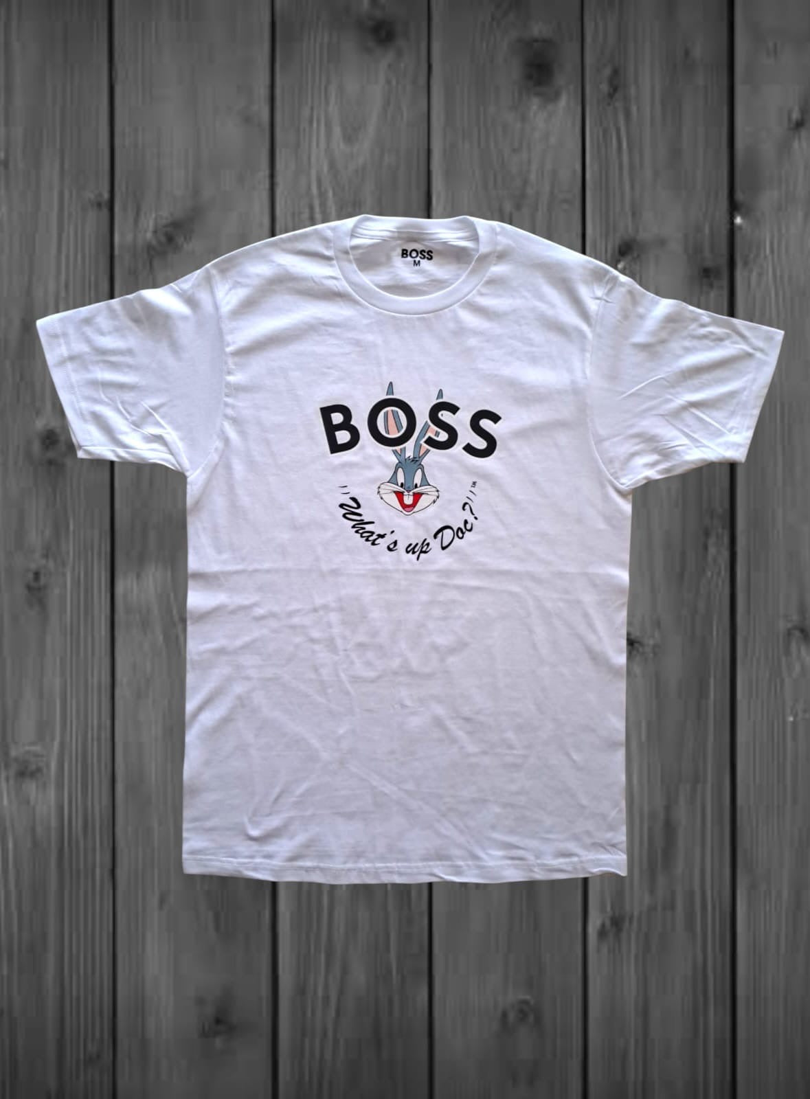 CAMISETA CABALLERO COLOR BLANCO; ESTAMPADO BUGS BUNNY Y LETRAS COLOR NEGRO