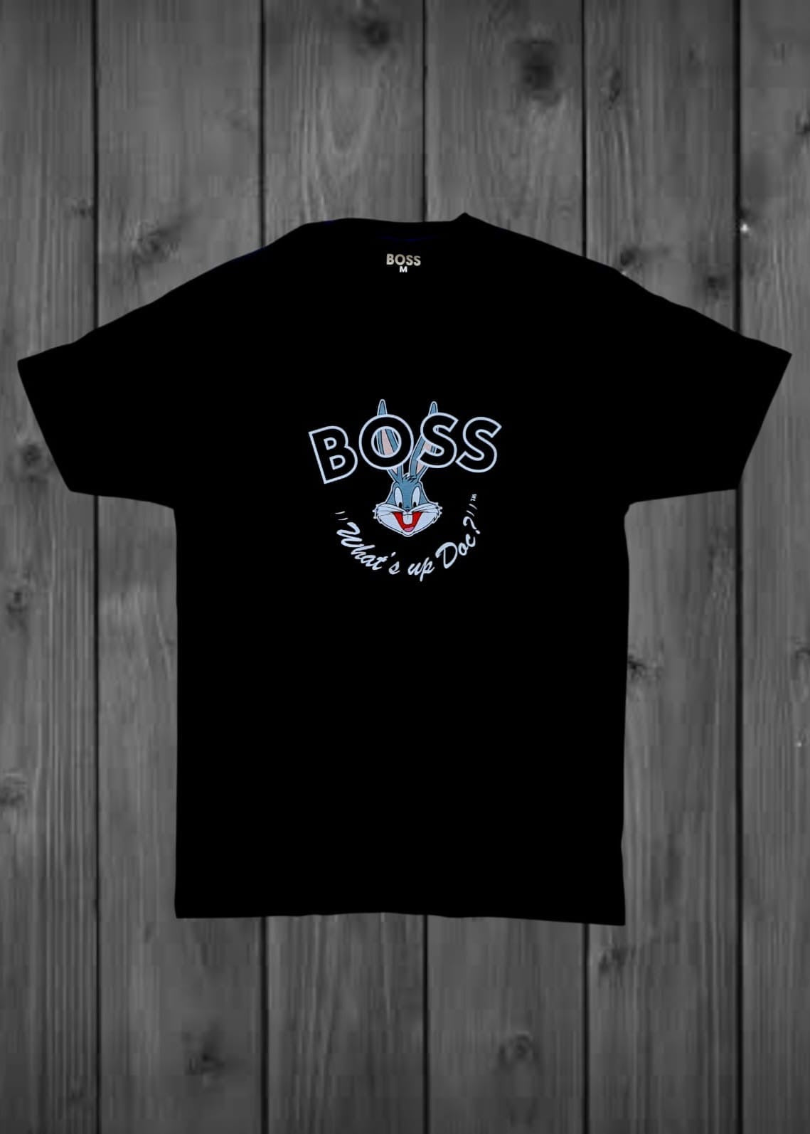 CAMISETA CABALLERO COLOR NEGRO; ESTAMPADO BUGS BUNNY Y LETRAS COLOR BLANCO
