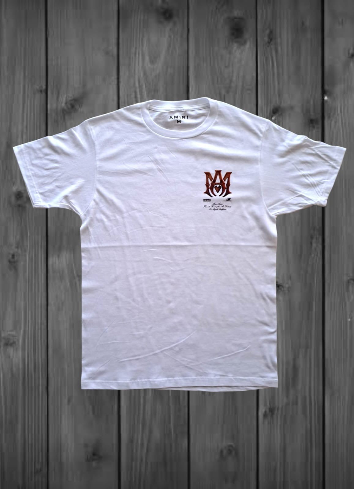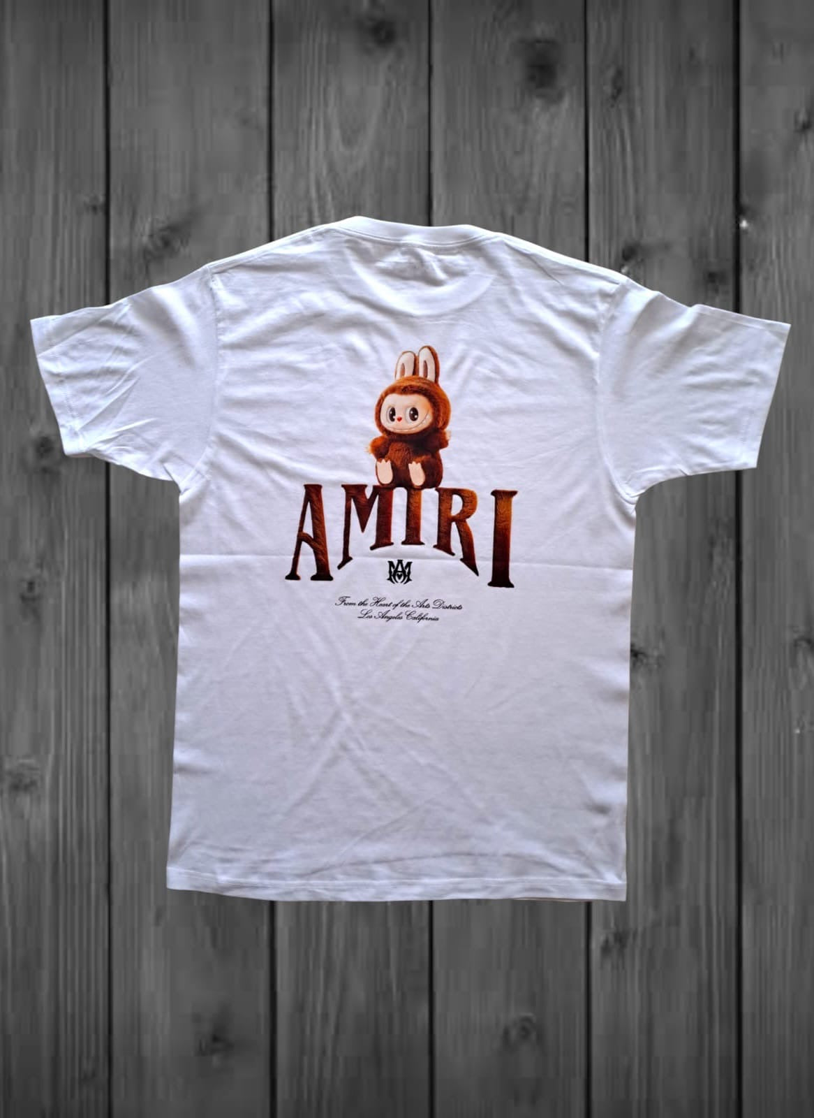 CAMISETA CABALLERO COLOR BLANCO; ESTAMPADO AL FRENTE LOGOTIPO AM COLOR ROJO Y EN ESPALDA LABUBU Y LETRAS COLOR ROJO