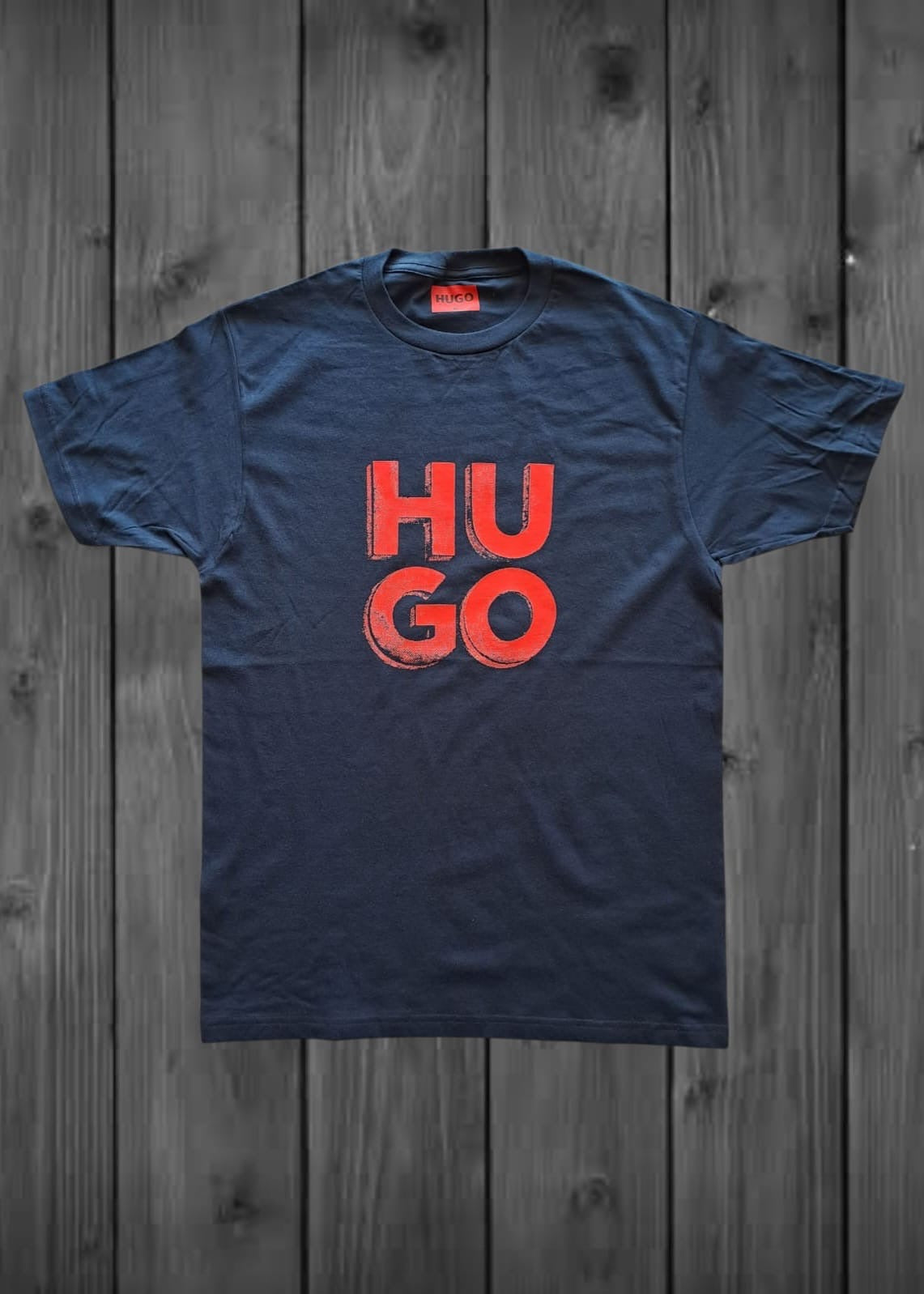 CAMISETA CABALLERO COLOR AZUL MARINO; ESTAMPADO LETRAS COLOR ROJO