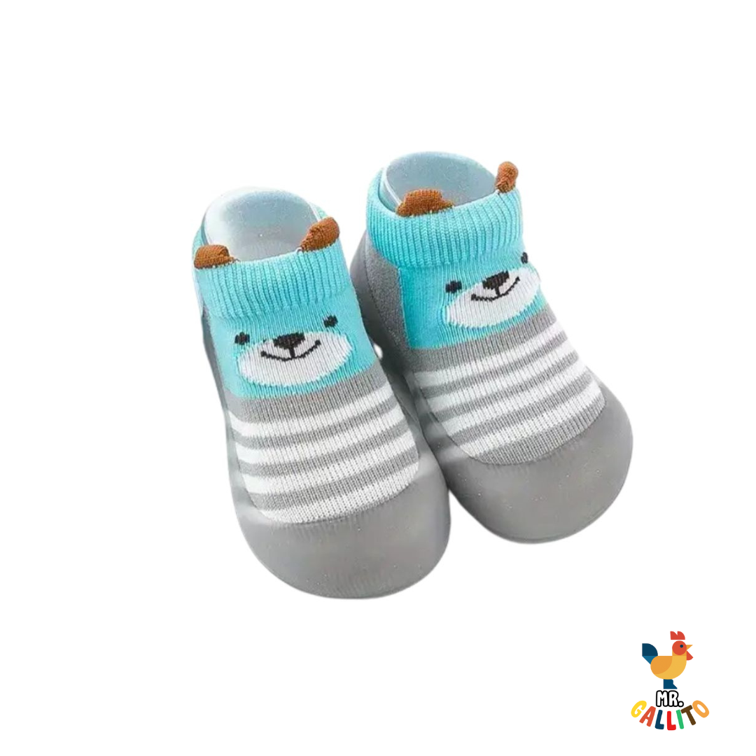 ZAPATO ANTIDERRAPANTE PARA BEBÉ ANIMALITOS COLOR GRIS Y "OSITO" COLOR AZUL CLARO