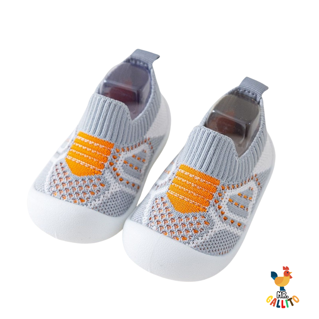 ZAPATO ANTIDERRAPANTE PARA BEBÉ TIPOTENIS COLOR GRIS CON DETALLES EN COLOR AMARILLO